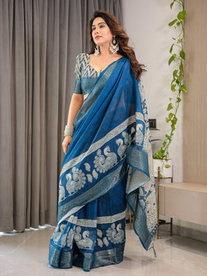 Royal Blue Kalamkari Digital Printed Linen Cotton Saree