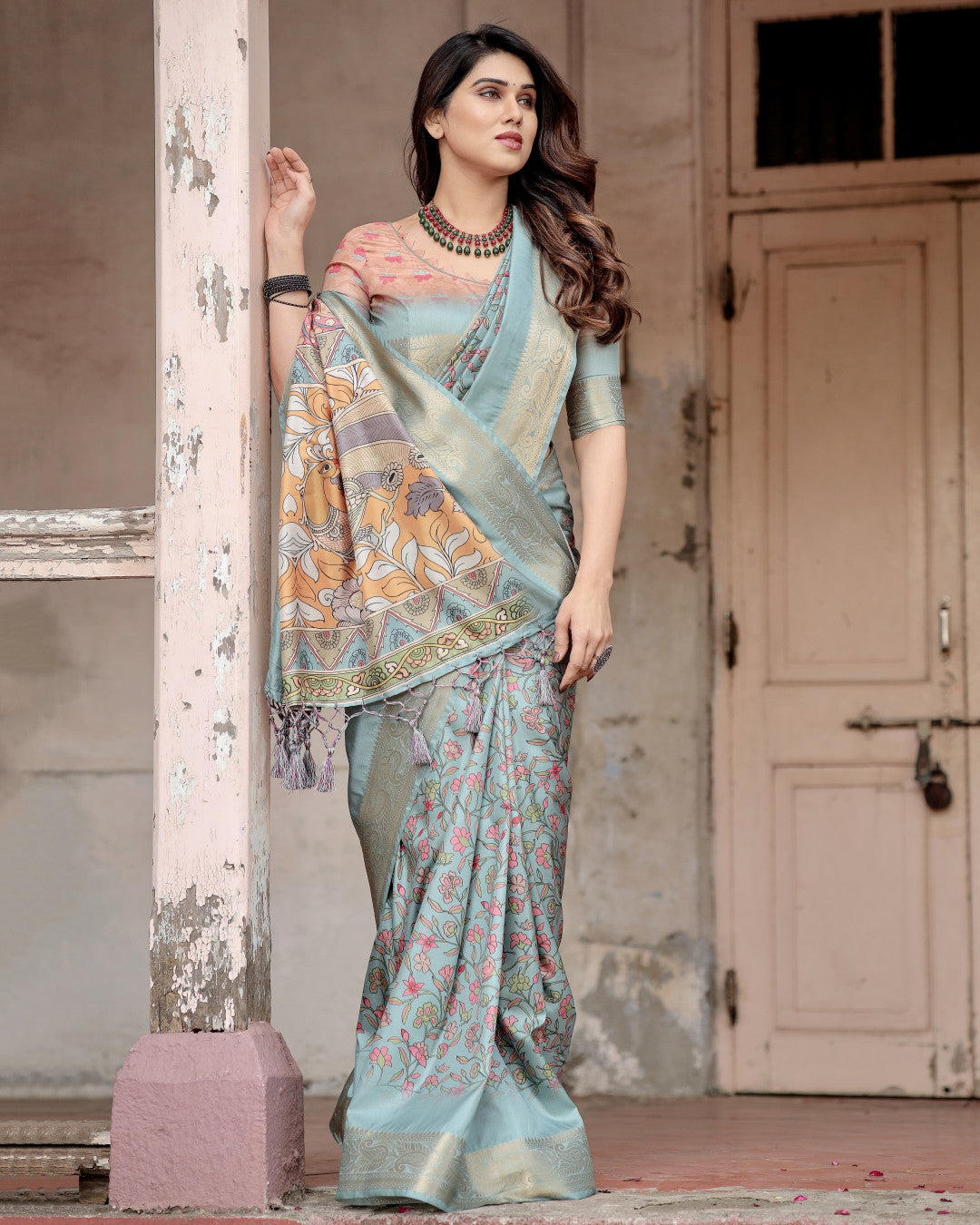 Sky Blue Kalamkari Digital Printed Dola Silk Saree With Gold Zari Border
