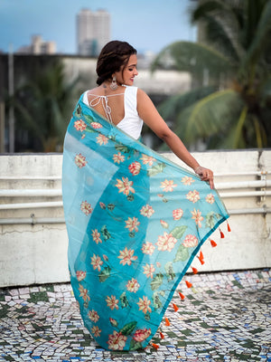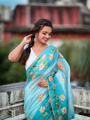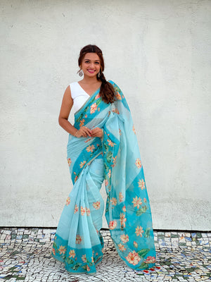 Sky Blue Pichwai Printed Chanderi Cotton Saree