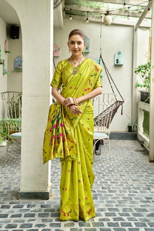 Traditional Parrot Green Paithani Silk Saree With Zari Weaving Work