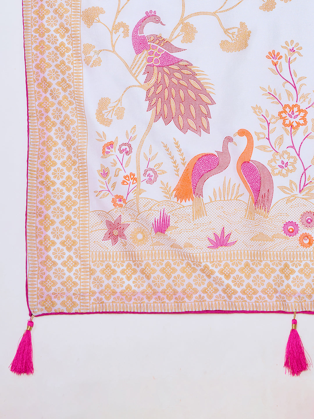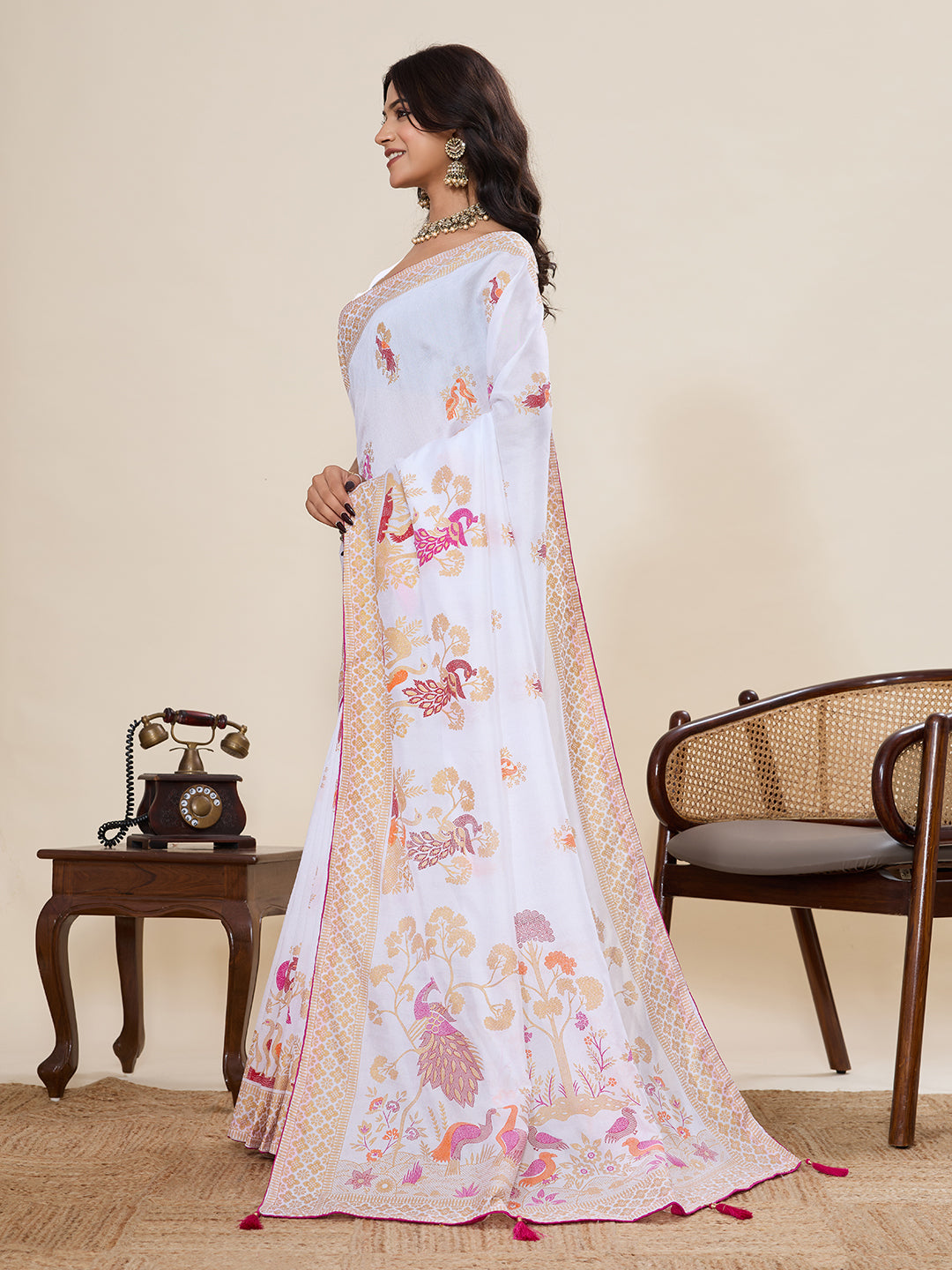 White Cotton Saree With Table Printed And Foil Work With Pipeing Border