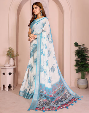 White Linen Cotton Saree With Digital Printed Work And Silver Zari Border