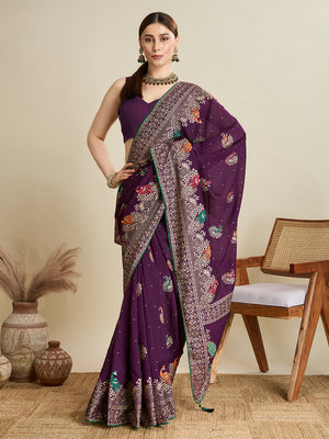 Wine Cotton Saree With Table Printed And Foil Work With Pipeing Border