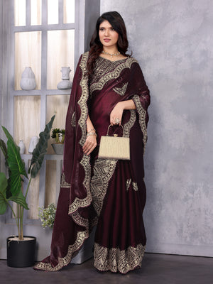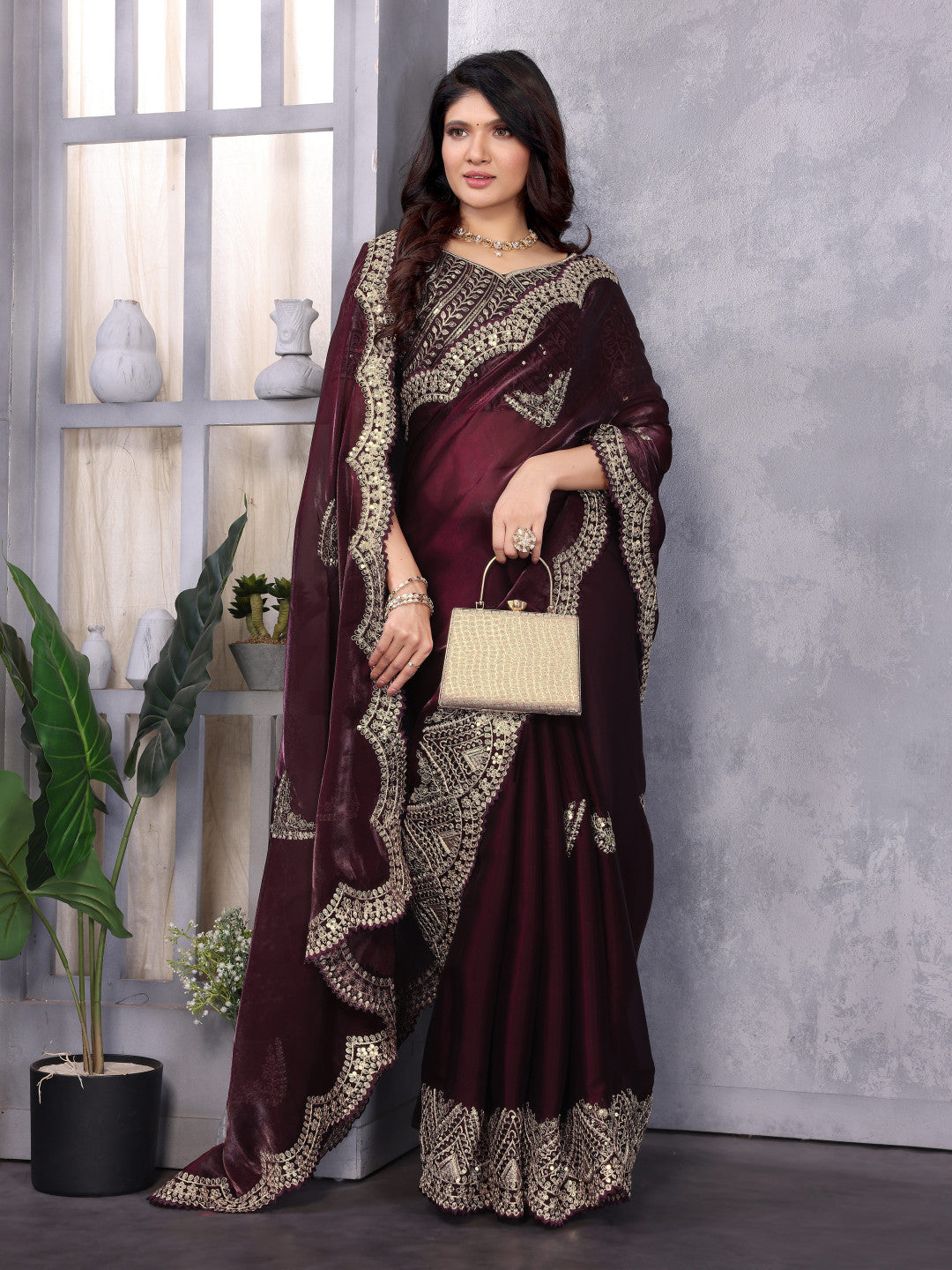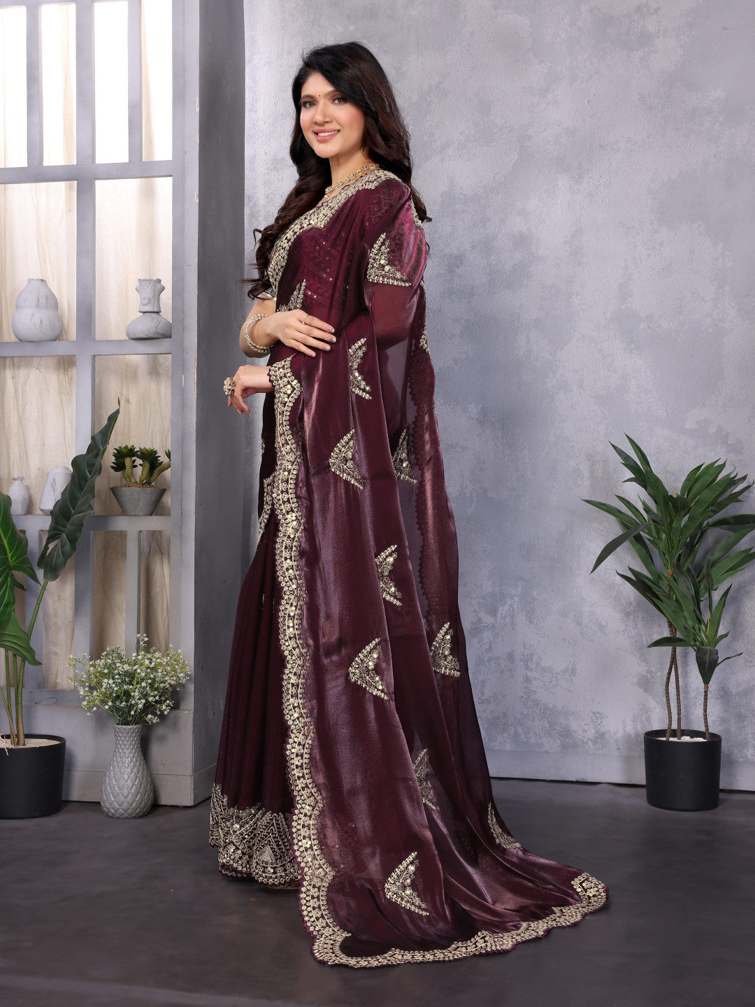 Wine Fancy Shimmer Chiffon Saree With Embroidery Work