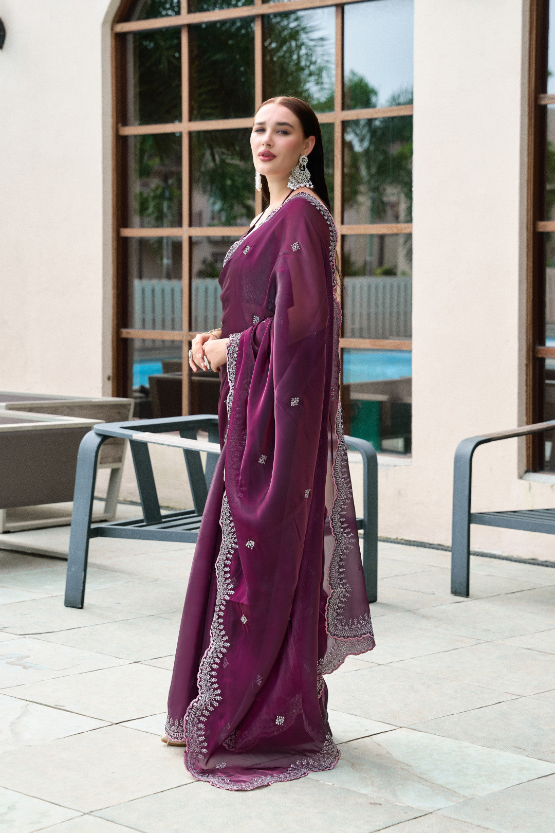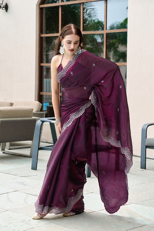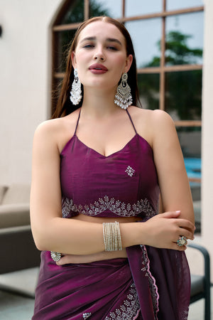 Wine Fancy Shimmer Chiffon Saree With Embroidery Work