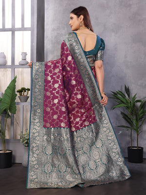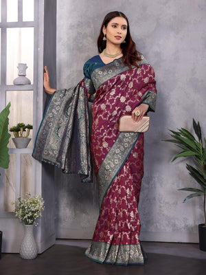 Wine Premium Banarasi Silk Saree With Zari Weaving Work