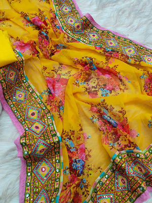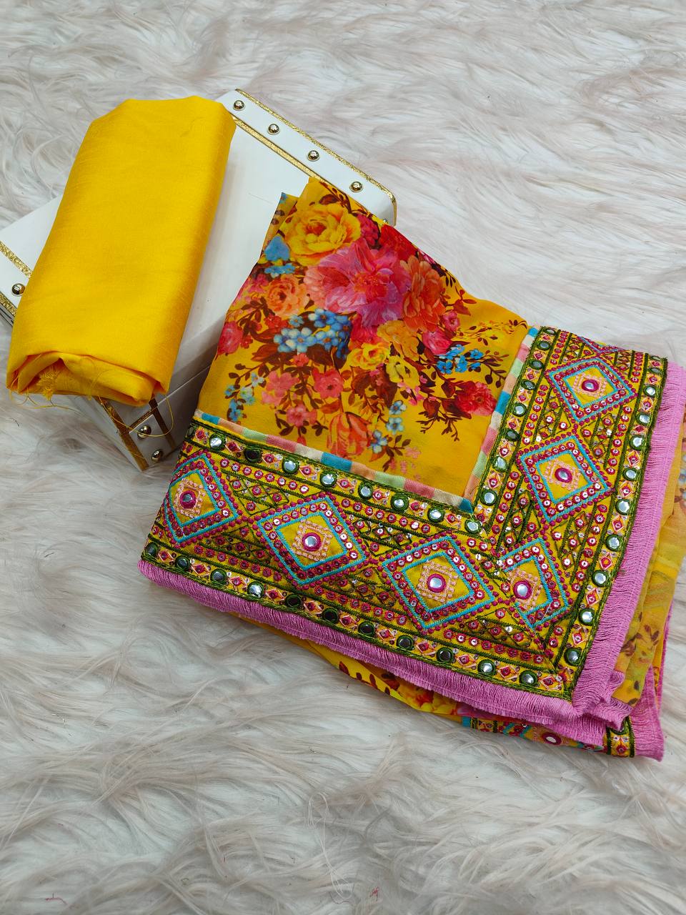 Yellow Georgette Saree With All Over Printed Work Flower Butta And Embroidery Lace Border
